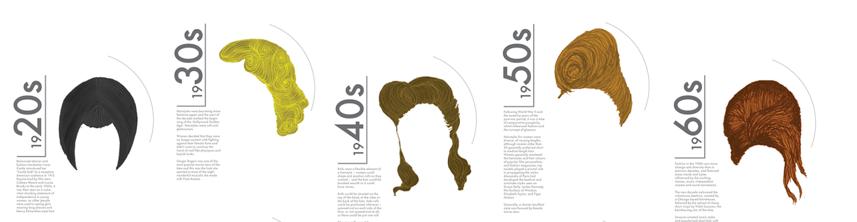 This timeline poster visually represents the evolution of ladies' hairstyles over the last 100 years. By illustrating key hair trends from each decade, I explored the societal and cultural shifts that influenced the way women styled their hair. The piece examines how something as simple as hairstyle can shape personal identity and reflect the changing values of different time periods.
